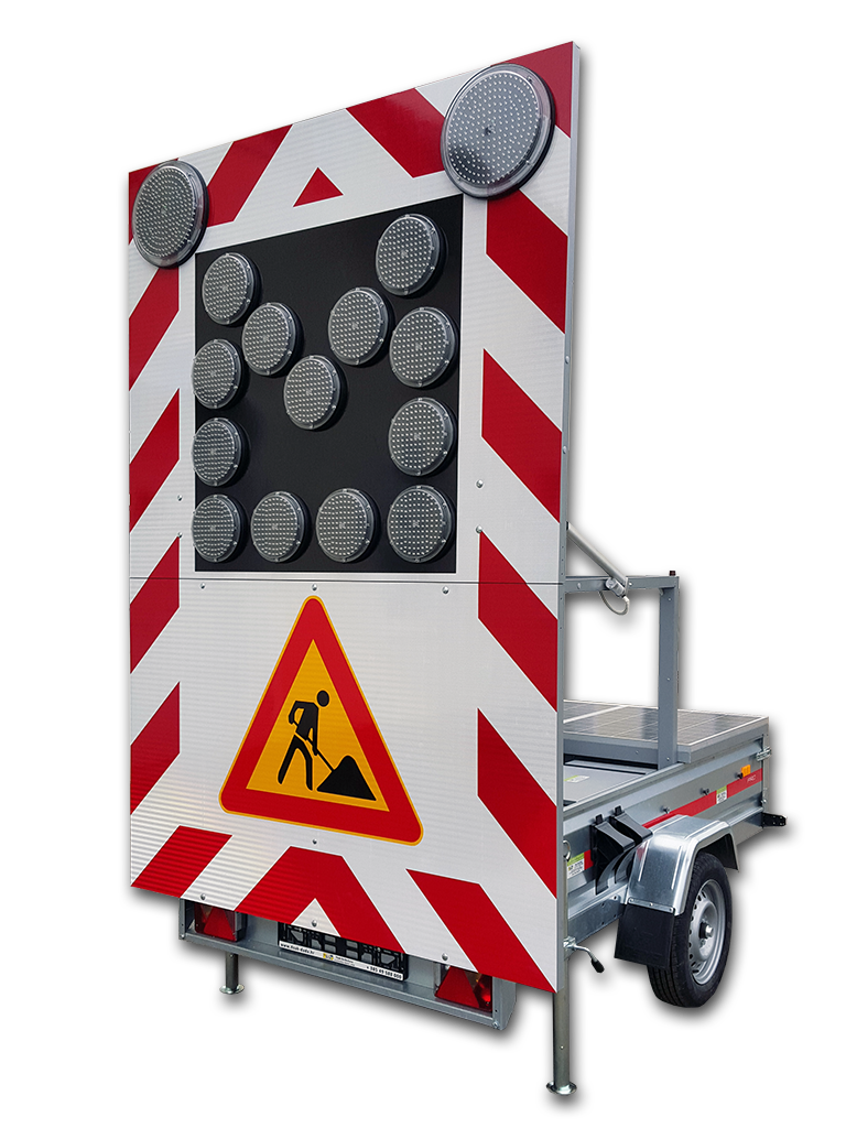 LED solarna signalna prikolica K24 (panel) sa treptačima i znakom samostalna je signalna jedinica koja služi za označivanje mjesta izvođenja radova, oštećenja na cesti ili pravovremenog informiranja sudionika u prometu na zatvoren prometni trak prilikom čega se vrši preusmjeravanje prometa.