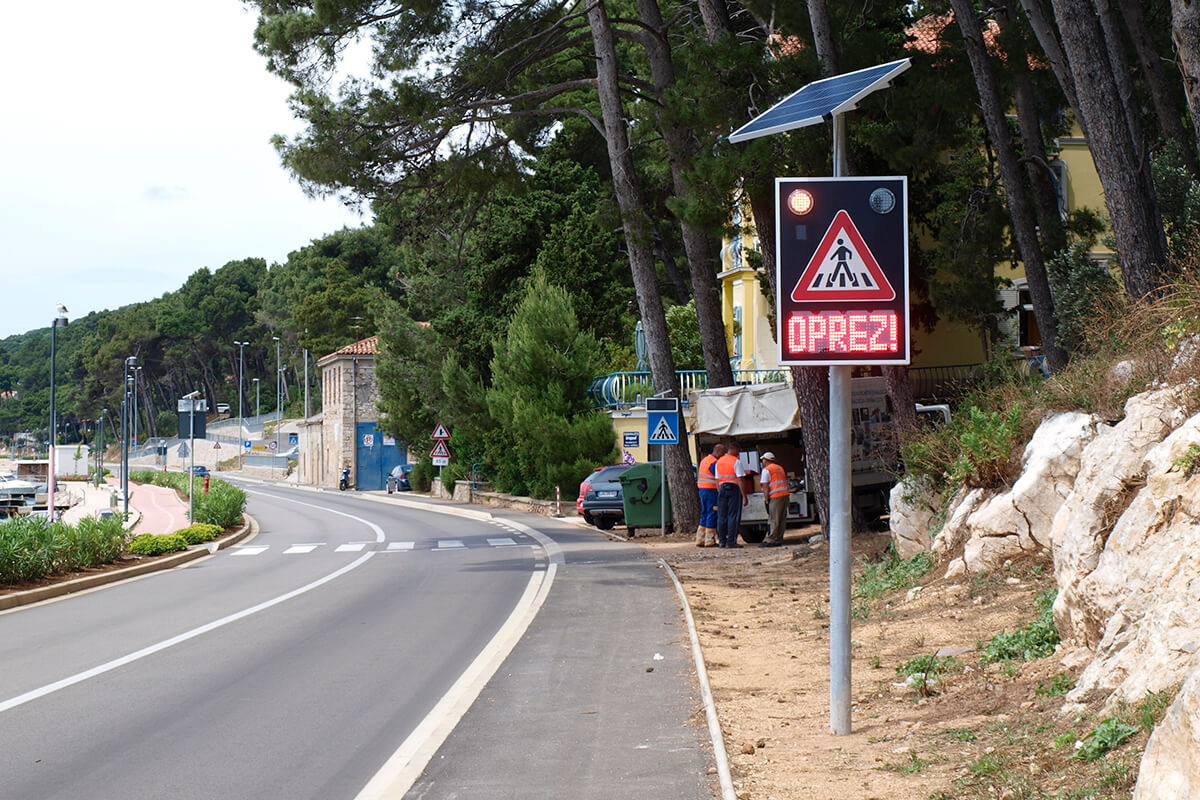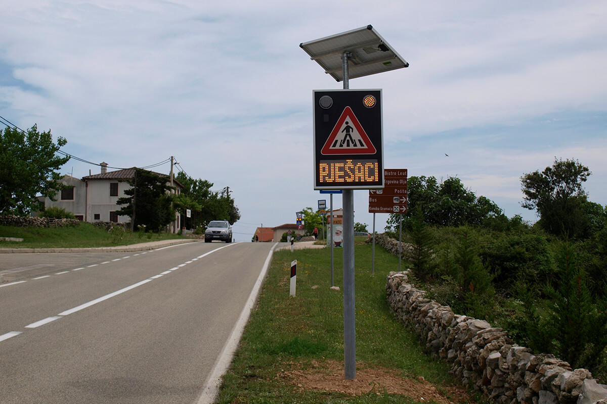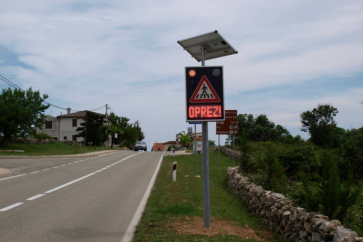 Solarni svjetlosni LED radarski uređaj OPREZ-PJEŠACI je uređaj sa radarskim mjerenjem brzine te dvostrukim pomoćnim displejom namijenjenim za obavještavanje vozača na nailazak na pješački prijelaz. Implementacijom mjerača brzine povećava se osviještenost vozača o nadolazećem pješačkom prijelazu, a samim time pridonosi sigurnosti pješaka i sigurnijem odvijanju prometa.