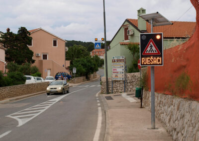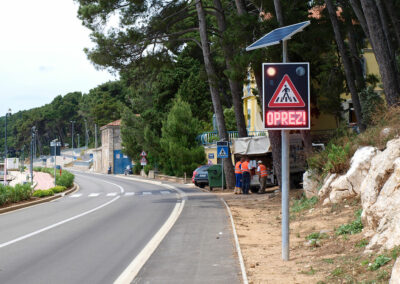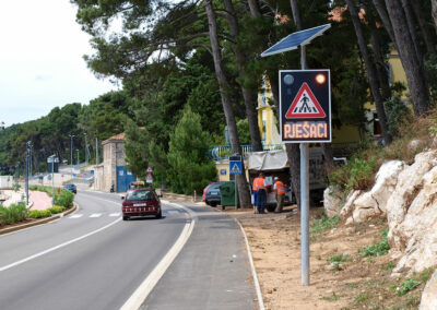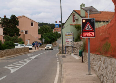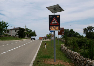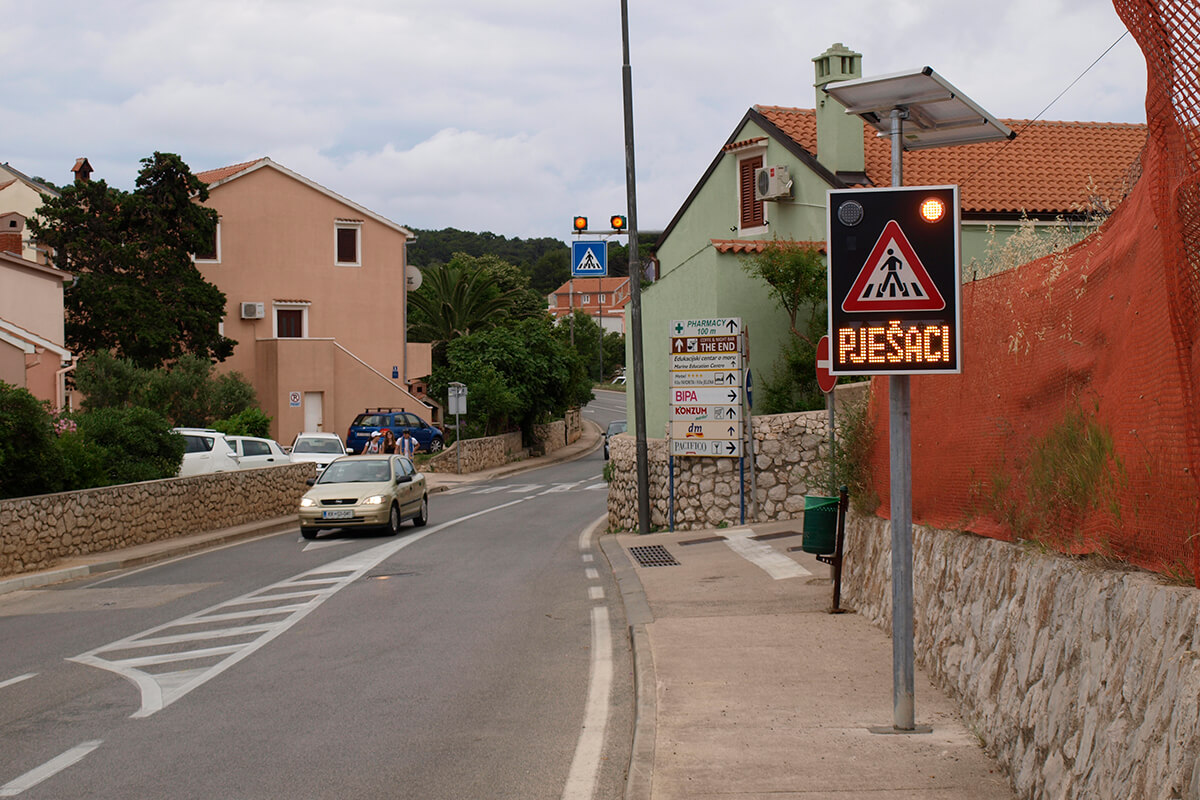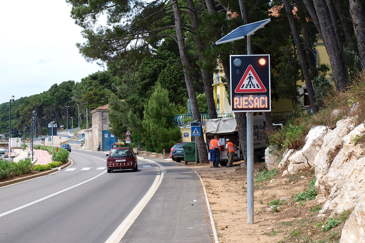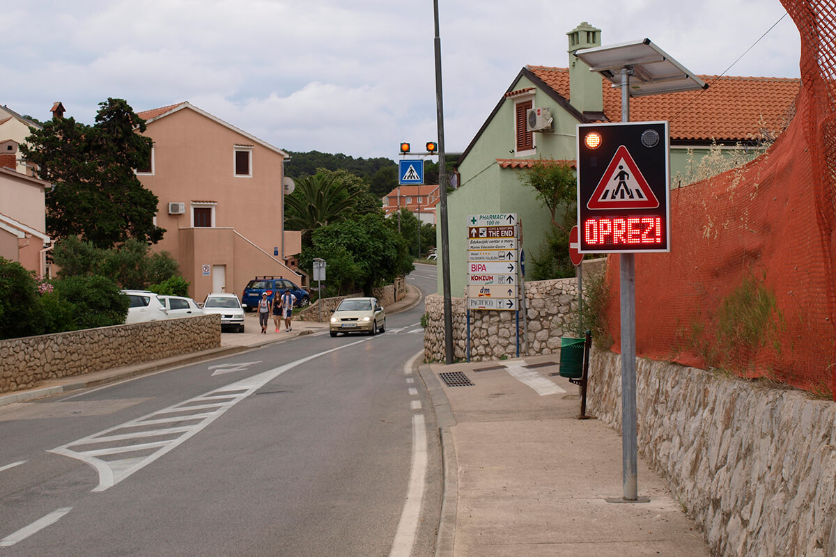 Solarni svjetlosni LED radarski uređaj OPREZ-PJEŠACI je uređaj sa radarskim mjerenjem brzine te dvostrukim pomoćnim displejom namijenjenim za obavještavanje vozača na nailazak na pješački prijelaz. Implementacijom mjerača brzine povećava se osviještenost vozača o nadolazećem pješačkom prijelazu, a samim time pridonosi sigurnosti pješaka i sigurnijem odvijanju prometa.