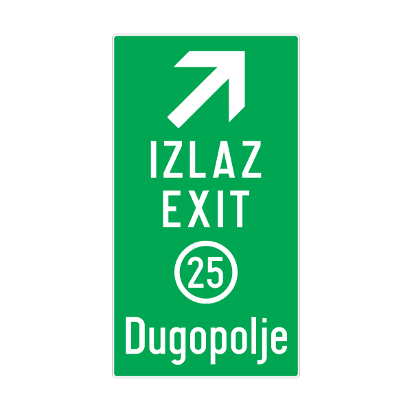 Označava mjesto izlaska s autoceste ili brze ceste. Znak postavljen na autocesti zelene je boje, a na brzoj cesti je plave boje. Znak se postavlja na vrhu razdjelnog otoka.