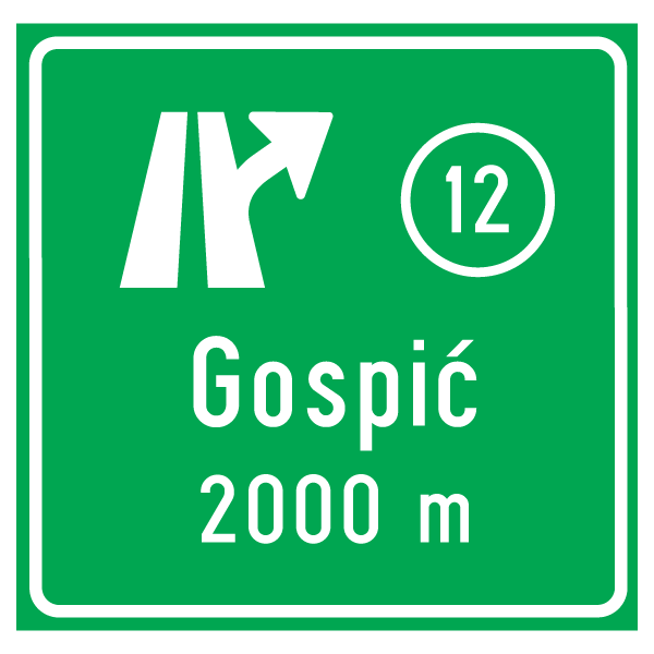 Najavljuje izlaz s autoceste ili brze ceste s oznakom izlaza. Ako se znak odnosi na autoceste, tada je zelene boje, a ako se odnosi na brze ceste plave je boje. Znak se izvodi najmanje s koeficijentom retrorefleksije razreda RA2. Prometni znak se, u pravilu, postavlja na udaljenosti od 2000 m prije početka izlazne prometne trake s autoceste ili brze ceste.