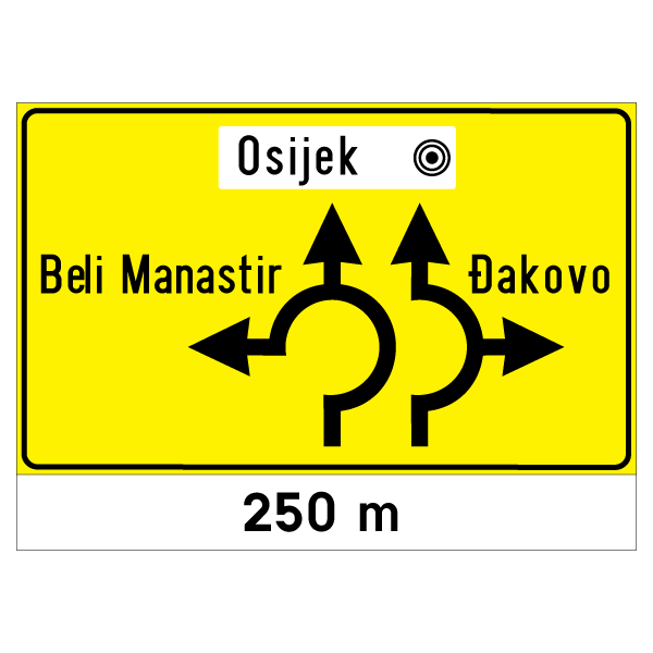 Označavaju međusobni položaj, smjerove cesta, brojeve cesta te nazive mjesta do kojih vode ceste što se križaju. Položaj strelica mora odgovarati položaju cesta na terenu. Položaj oznake broja ceste iznad strelice za ravno može biti lijevo ili ispod naziva mjesta ovisno o broju cesta i broju naziva mjesta koje je potrebno naznačiti. Položaj oznake broja ceste za lijevo i desno može biti u smjeru strelice ili ispod naziva mjesta. Znakovi se postavljaju na udaljenosti od najmanje 150 m ispred raskrižja na koje se odnosi. Boja podloge znaka određuje se prema vrsti ceste na koju se znak postavlja. Za odredišta koja se nalaze na cestama druge vrste upotrebljava se umetnuta podloga, čija boja odgovara vrsti ceste na koju se upućuje. Maksimalan broj naziva odredišta na znaku, u svim smjerovima, je šest. U jednom smjeru maksimalno je moguće označiti tri naziva odredišta. Znakovi se izvode najmanje s koeficijentom retrorefleksije razreda RA2. Znak može sadržavati broj i oznaku ceste, »nacionalna auto oznaka« (C124) te simbol graničnog prijelaza.