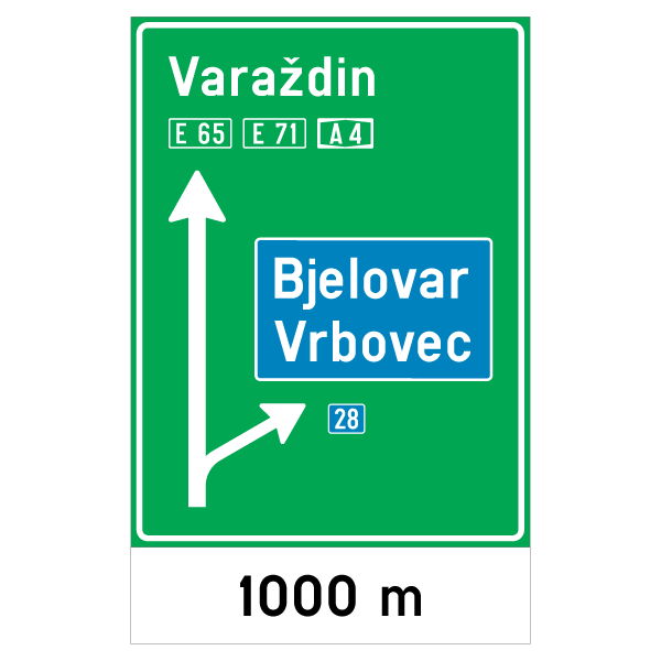 Označavaju ime izlaza ili izdvajanje na autocesti i cestama s raskrižjima u više razina. Položaj strelica mora odgovarati položaju cesta na terenu. Položaj oznake broja ceste iznad strelice za ravno može biti lijevo ili ispod naziva mjesta, ovisno o broju cesta i broju naziva mjesta koje je potrebno naznačiti. Znak D04-1 postavlja se na interregionalnim čvorištima. Kad se znak D04-2 izvodi na portalu u trećem stupnju obavijesti, nema bijelog polja nego se udaljenost do izlaza upisuje u zeleno polje ispred broja ceste na koju se izlazi. Boja podloge znaka određuje se prema vrsti ceste na koju se znak postavlja. Za odredišta koja se nalaze na cestama druge vrste upotrebljava se umetnuta podloga čija boja odgovara vrsti ceste na koju se upućuje. Maksimalan broj naziva odredišta na znaku, u svim smjerovima, je šest. U jednom smjeru maksimalno je moguće označiti tri naziva odredišta. Znakovi se izvode najmanje s koeficijentom retrorefleksije razreda RA2. Znakovi D04 i D04-1 postavljaju se s desne strane kolnika, a znak D04-2 postavlja se na portalu iznad kolnika. Znak može sadržavati broj i oznaku ceste, »nacionalna auto oznaka« (C124) te simbol graničnog prijelaza.
