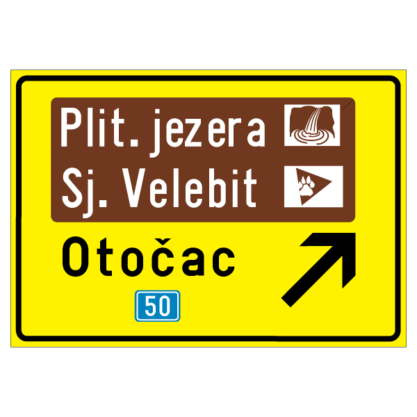 Na autocesti i cesti s raskrižjima u više razina označavaju smjer kretanja do naseljenih mjesta ispisanih na znakovima. Na znakovima mogu biti ispisana tri mjesta uključujući i nazive nacionalnog parka, svetišta, olimpijskog centra ili nekog drugog sadržaja od nacionalnog značaja. Položaj strelica na znakovima mora odgovarati prometnoj situaciji, odnosno smjeru kretanja pojedinih prometnih traka. Boja podloge znaka određuje se prema vrsti ceste na koju se upućuje. Za odredišta koja se nalaze na cestama druge vrste upotrebljava se umetnuta podloga čija boja odgovara vrsti ceste na koju se upućuje ili je određena posebnim propisom. Ukoliko cesta vodi prema mjestu u drugoj državi ili graničnom prijelazu s lijeve strane od naziv može se umetnuti znak »zabrana prolaska bez zaustavljanja« (B33) koji označava granični prijelaz. Znakovi se izvode najmanje s koeficijentom retrorefleksije razreda RA2. Na znaku se može izvesti oznaka broja ceste, »nacionalna auto oznaka« (C124) te odgovarajući simbol. Znakovi se postavljaju na prilazima i u zoni raskrižja u više razina, dviju autocesta odnosno brzih cesta na mjestima na kojima počinje traka za usporenje vozila.